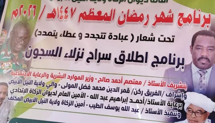 عبد الله يوسف أمين الزكاة ولاية النيل الأبيض المكلف بشر الغارمين النزلاء أن النصف الأول من العام الحالي سيشهد اطلاق سراح عدد من النزلاء و الآن تم اطلاق عدد (٣٧) نزيل بأكثر من مائة وتسعة مليون جنية كما أعلن عن منح كل مفرج عنه مبلغ مائة الف جنية
