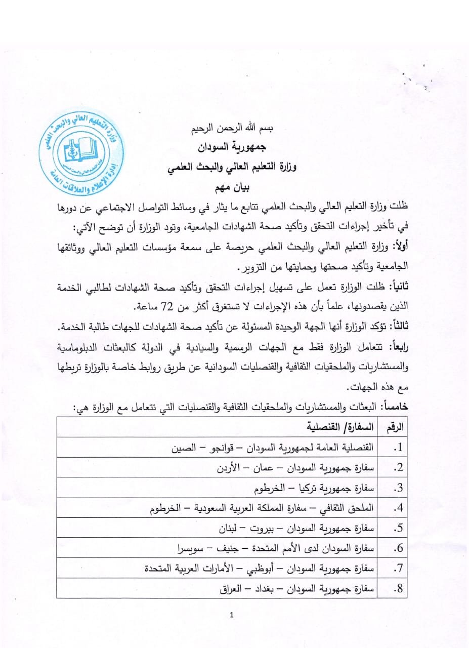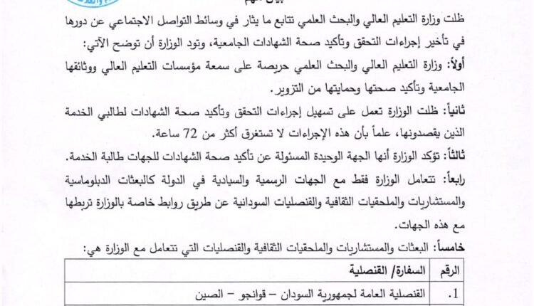 وأوضحت الوزارة في بيان لها أنها تتابع ما يتم تداوله عبر وسائل التواصل الاجتماعي بشأن دورها في تأخير إجراءات التحقق من الشهادات الجامعية، مبينة أن إجراءات التحقق وتأكيد صحة الشهادات لطالبي الخدمة لا تستغرق أكثر من 72 ساعة. وشددت الوزارة على أنها الجهة الوحيدة المخولة بتأكيد صحة الشهادات الجامعية للجهات الطالبة للخدمة، مؤكدة أن تعاملها يتم حصراً مع الجهات الرسمية والسيادية في الدولة، مثل البعثات الدبلوماسية والمستشاريات والملحقيات الثقافية والقنصليات السودانية، وذلك عبر روابط إلكترونية خاصة تربط هذه الجهات بالوزارة.